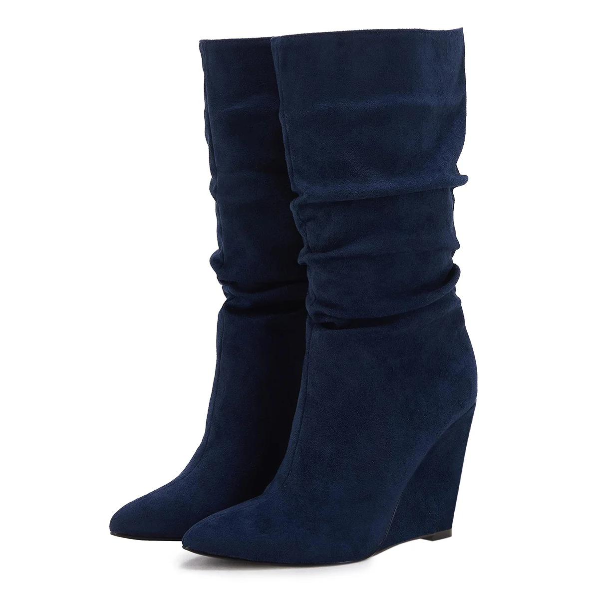 Navy Blue Faux Suede Pointed Toe Wedge Heel Elegant Slouch Boots