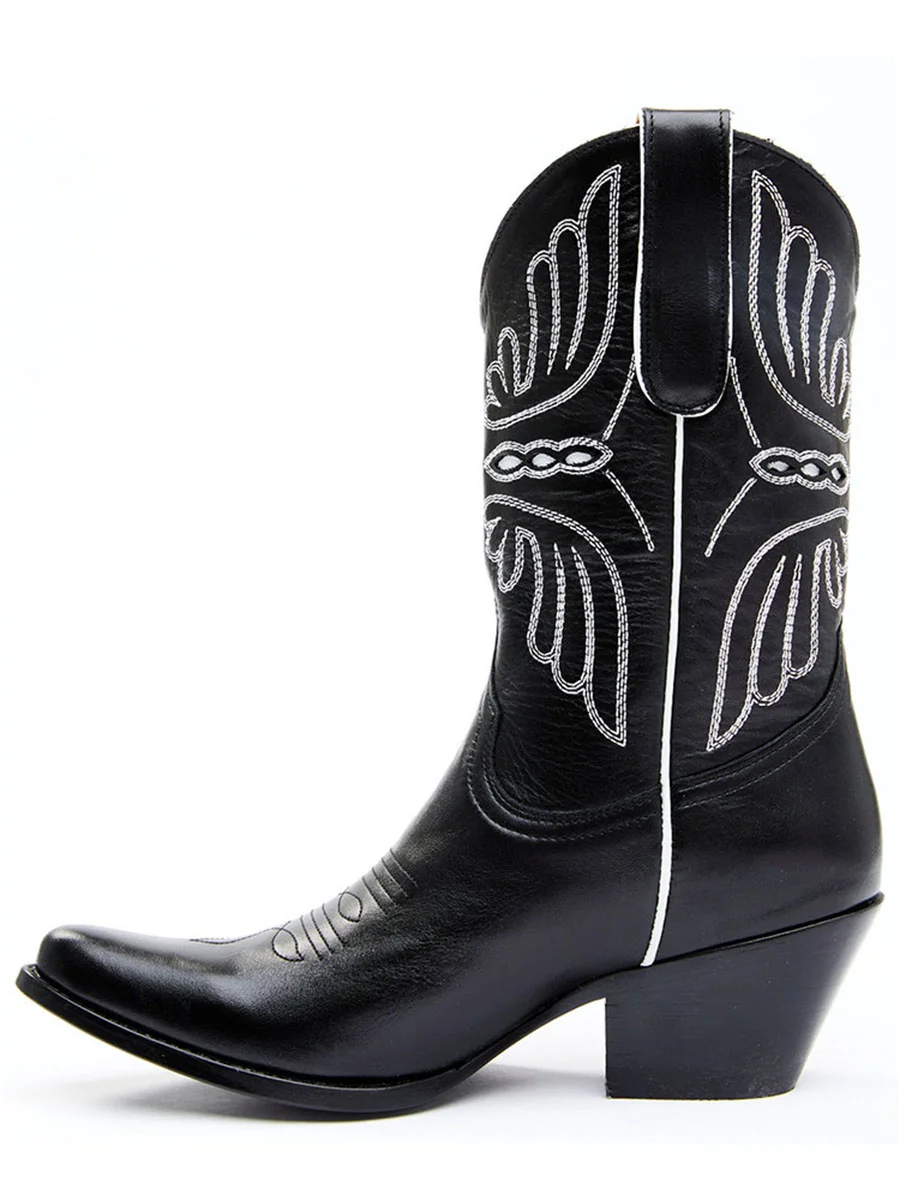 Black Pointed Toe Embroidered Mid-Calf Cowgirl Boots With Chunky Heels