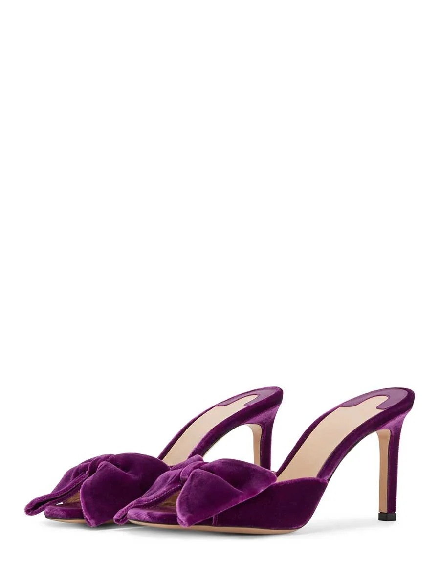 Velvet Square Toe Oversized Bow High Heel Mules in Purple